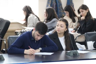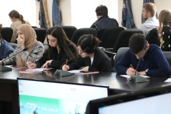 Студенты ЮФУ Валерий Левшин и Елизавета Шкурат презентовали студенческие проекты Объединенного совета обучающихся ЮФУ и рассказали о развитии сотрудничества между студенческими объединениями вузов и регионов. Продолжилось мероприятие проведением комплексного социологического исследования «Образ России настоящего и будущего глазами студенческой молодежи Кавказа» – работой с фокус-группой по теме «Россия: образ будущего» и социологического опроса по теме «Россия: образ настоящего».